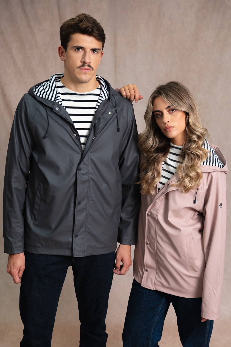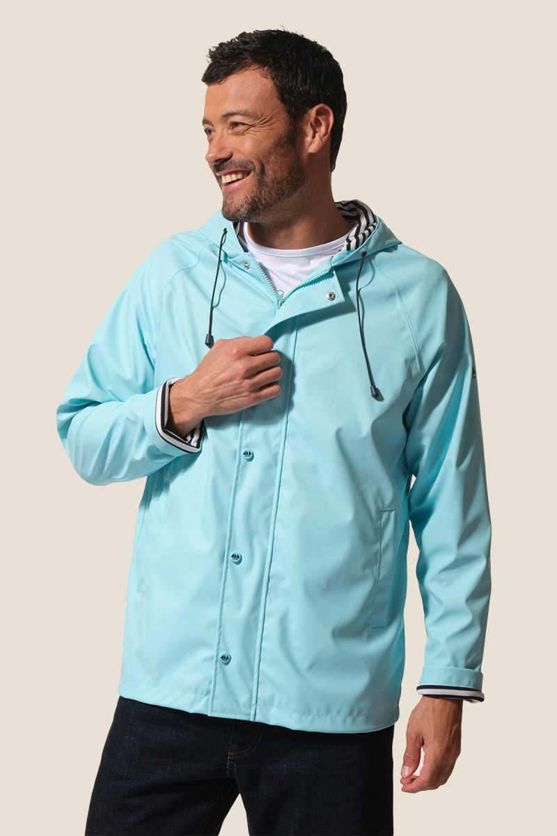 Restez au sec avec notre ciré authentique marin Proue. Sa doublure en jersey rayé apporte douceur et confort, tandis que sa coupe droite et sa capuche ajustable vous protègent efficacement sous la pluie.