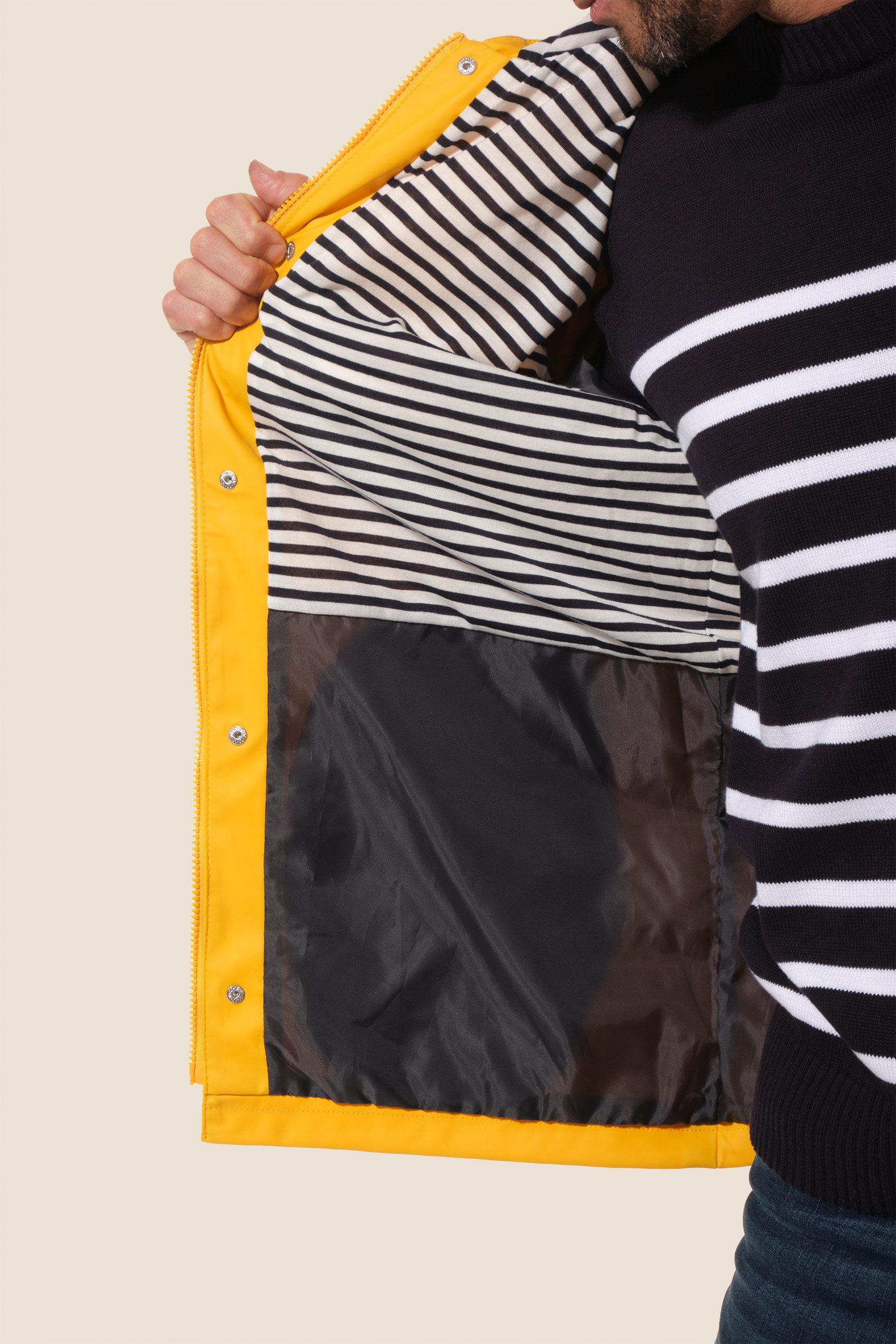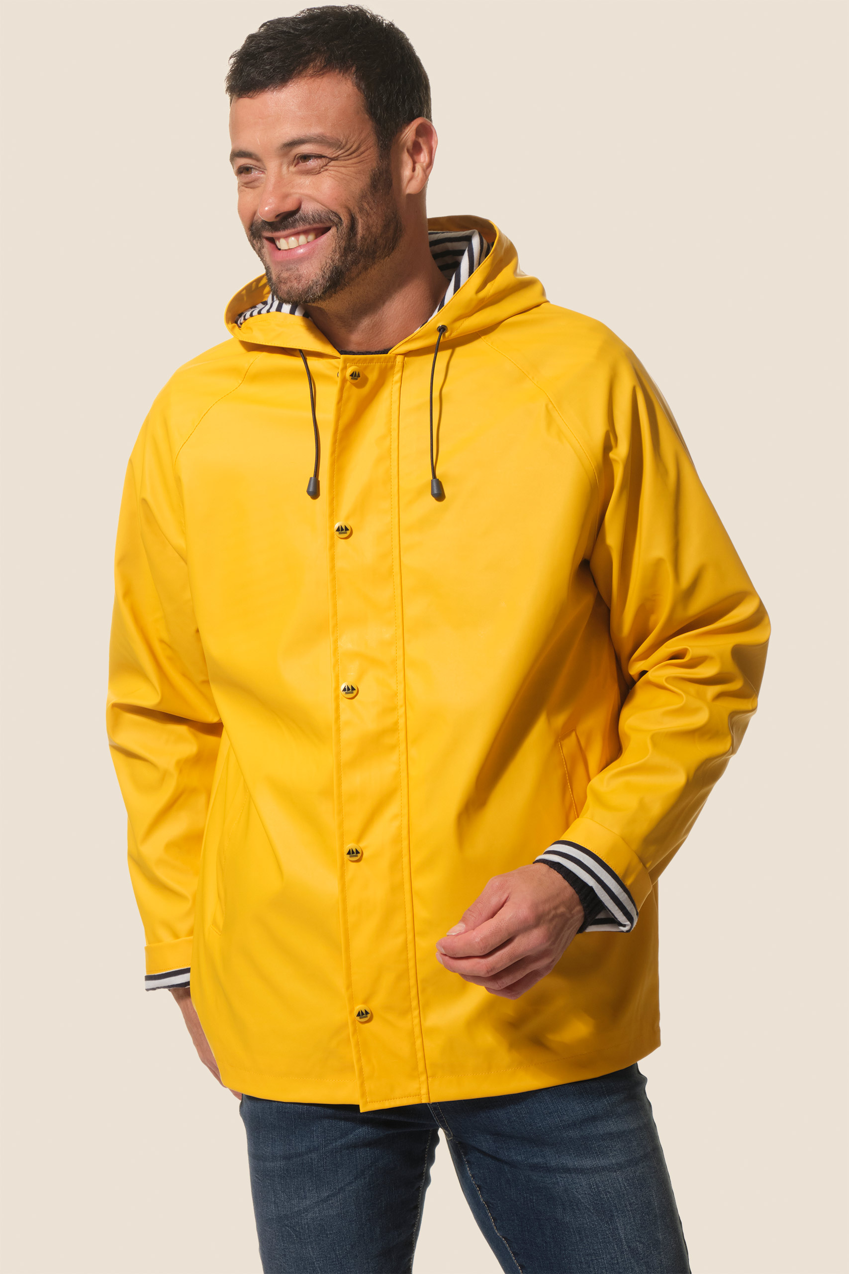 Restez au sec avec notre ciré authentique marin Proue. Sa doublure en jersey rayé apporte douceur et confort, tandis que sa coupe droite et sa capuche ajustable vous protègent efficacement sous la pluie.