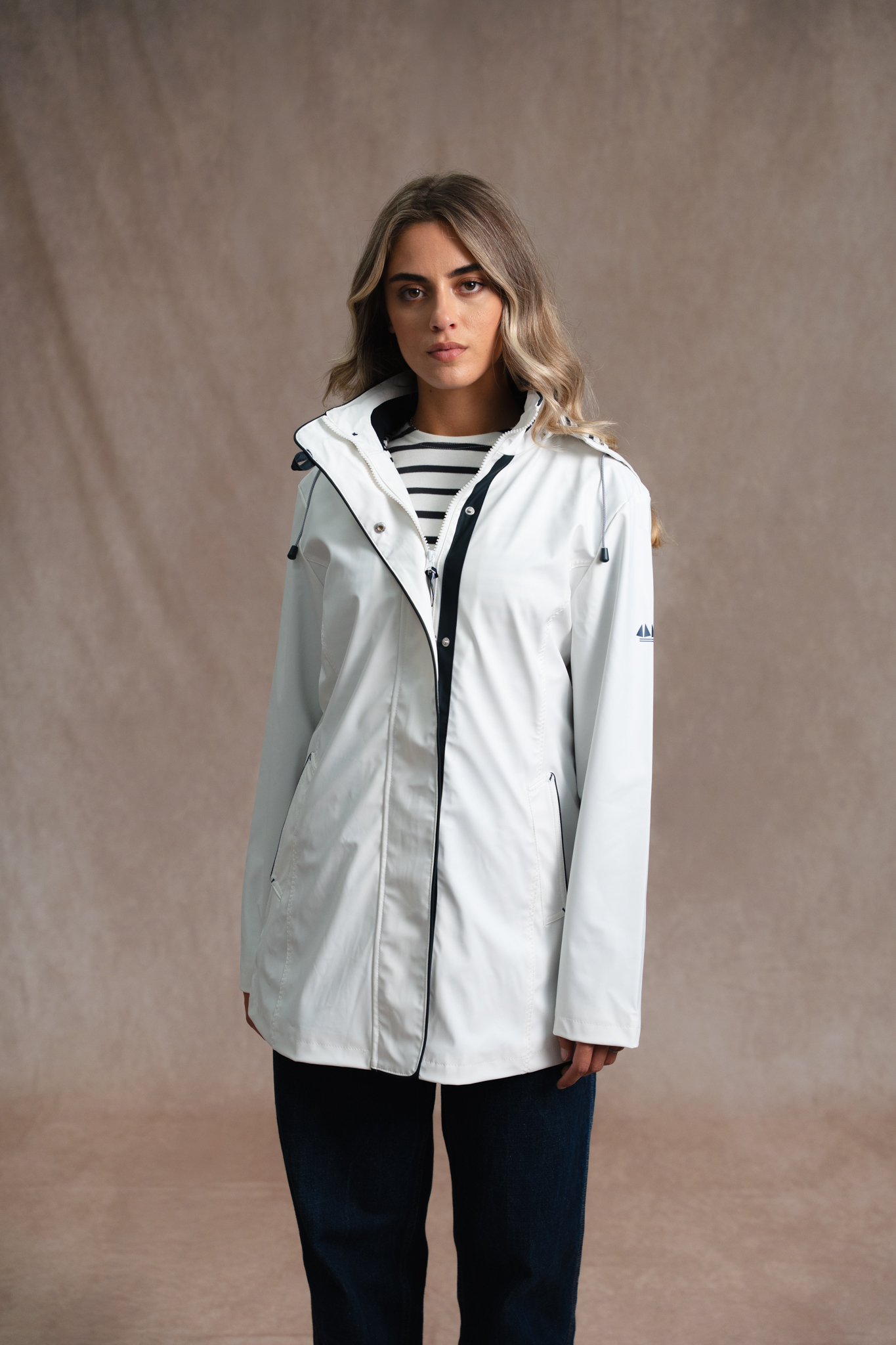 Ce ciré femme 3/4 allie élégance et fonctionnalité. Sa coupe droite légèrement évasée et sa doublure jersey rayée apportent confort et style, tandis que la capuche amovible doublée et le col montant protègent des intempéries.