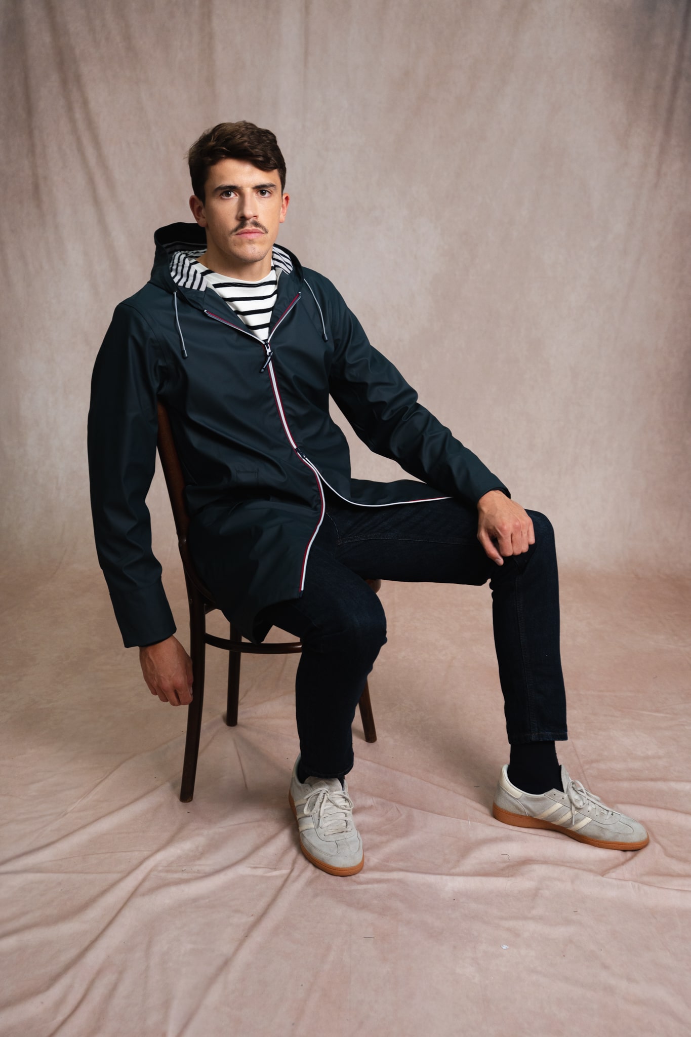 - Capuche doublée en jersey rayé avec lien de serrage élastiqué