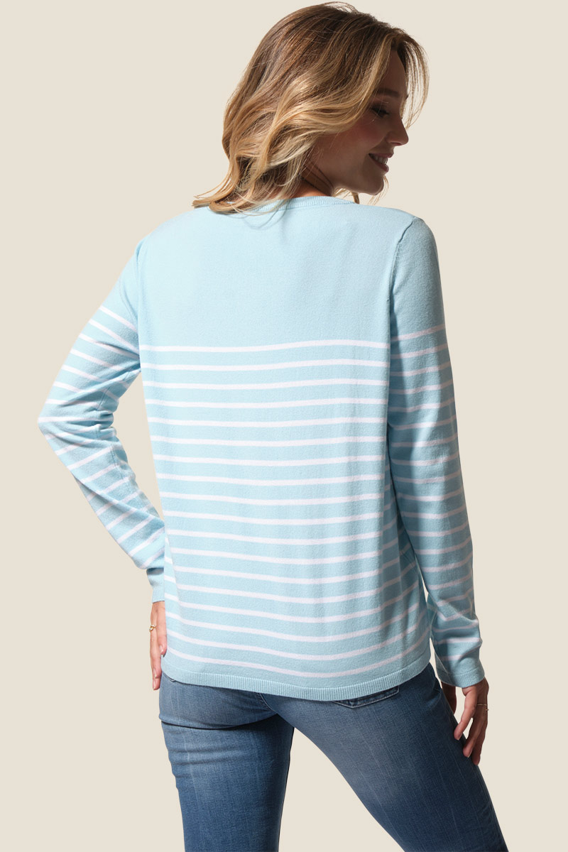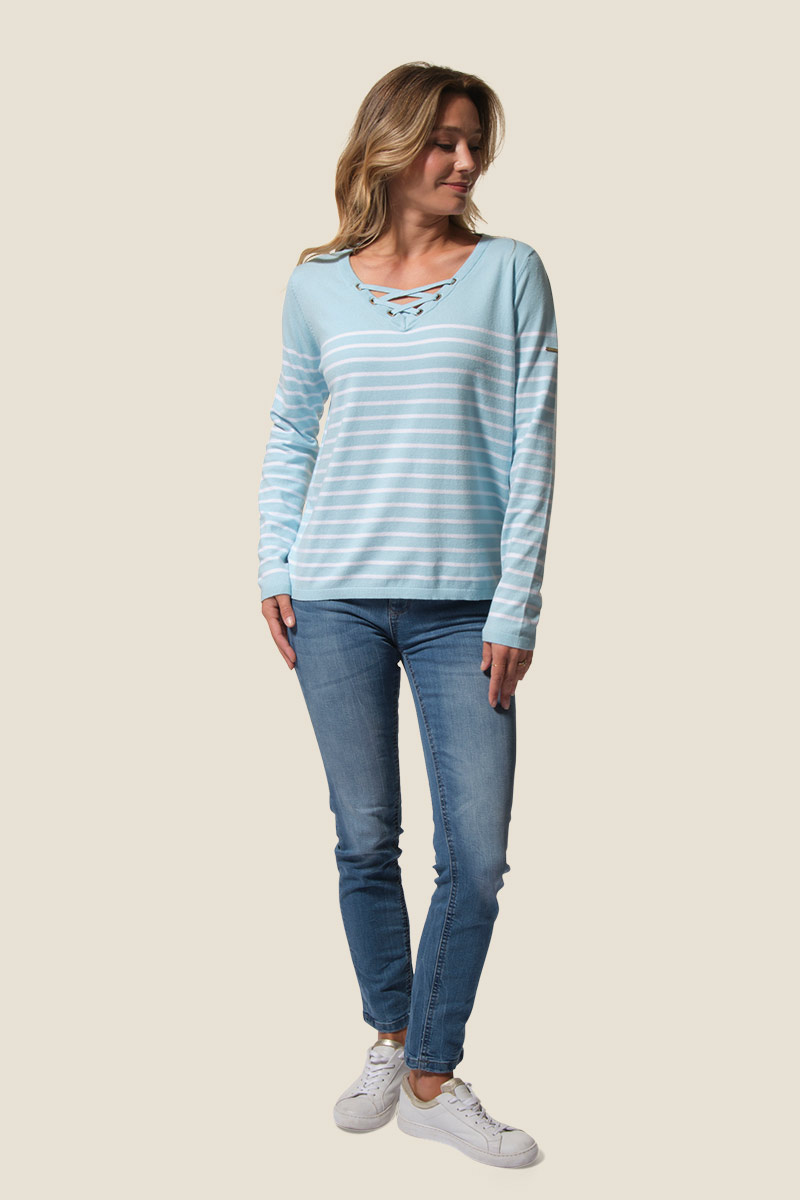 Le pull Blanche revisite la marinière avec élégance grâce à sa maille jersey rayée et sa coupe droite confortable. Son col V orné d’un lacet décoratif et la plaque logo dorée sur la manche apportent une touche raffinée, pour un essentiel féminin chic et facile à porter.